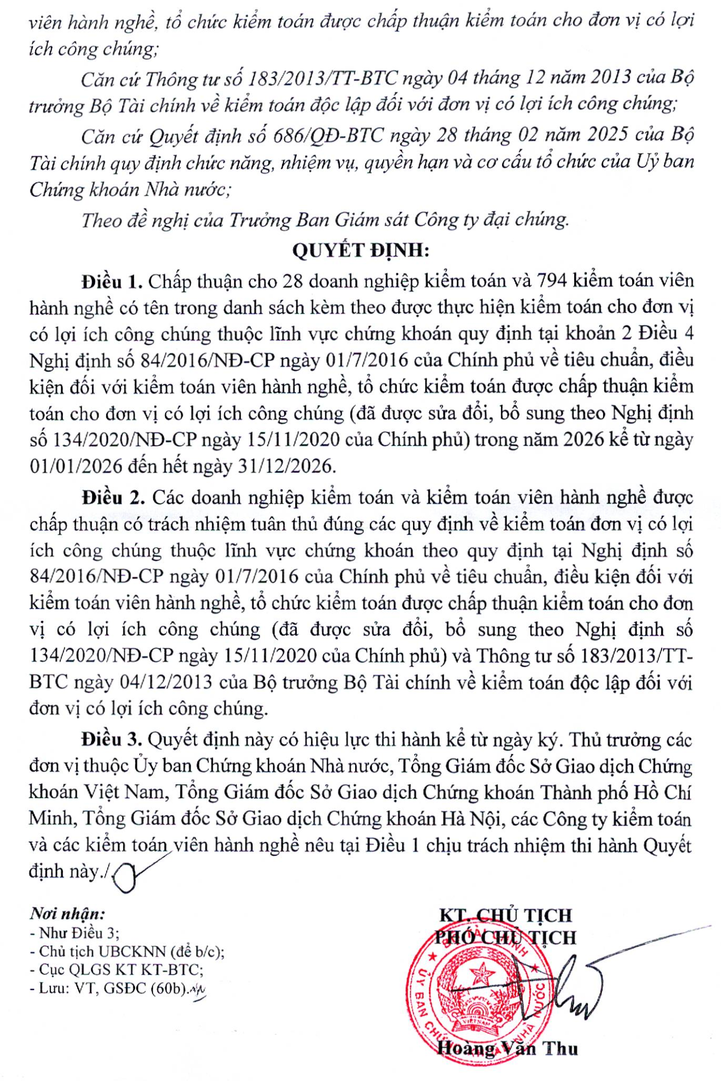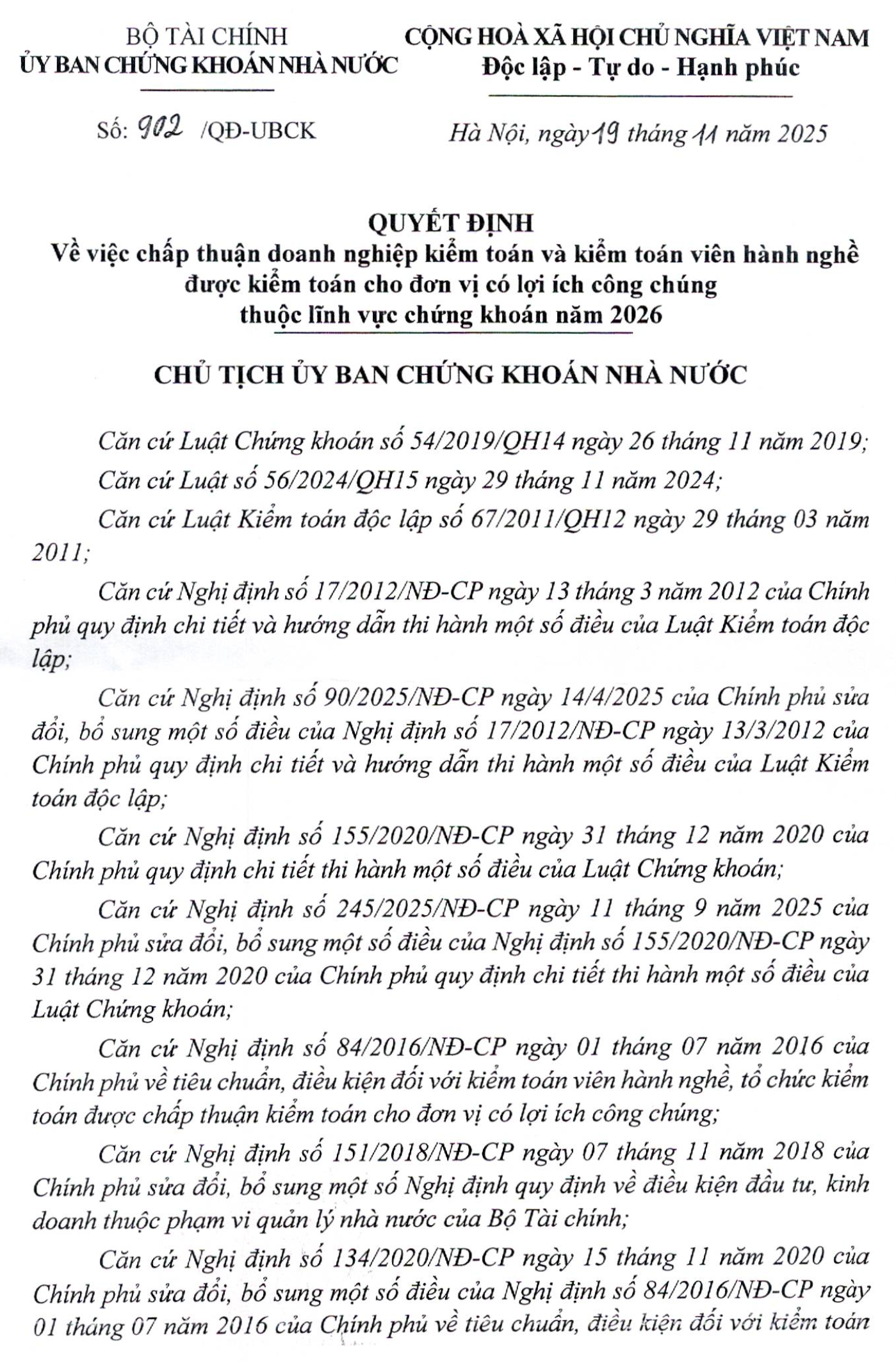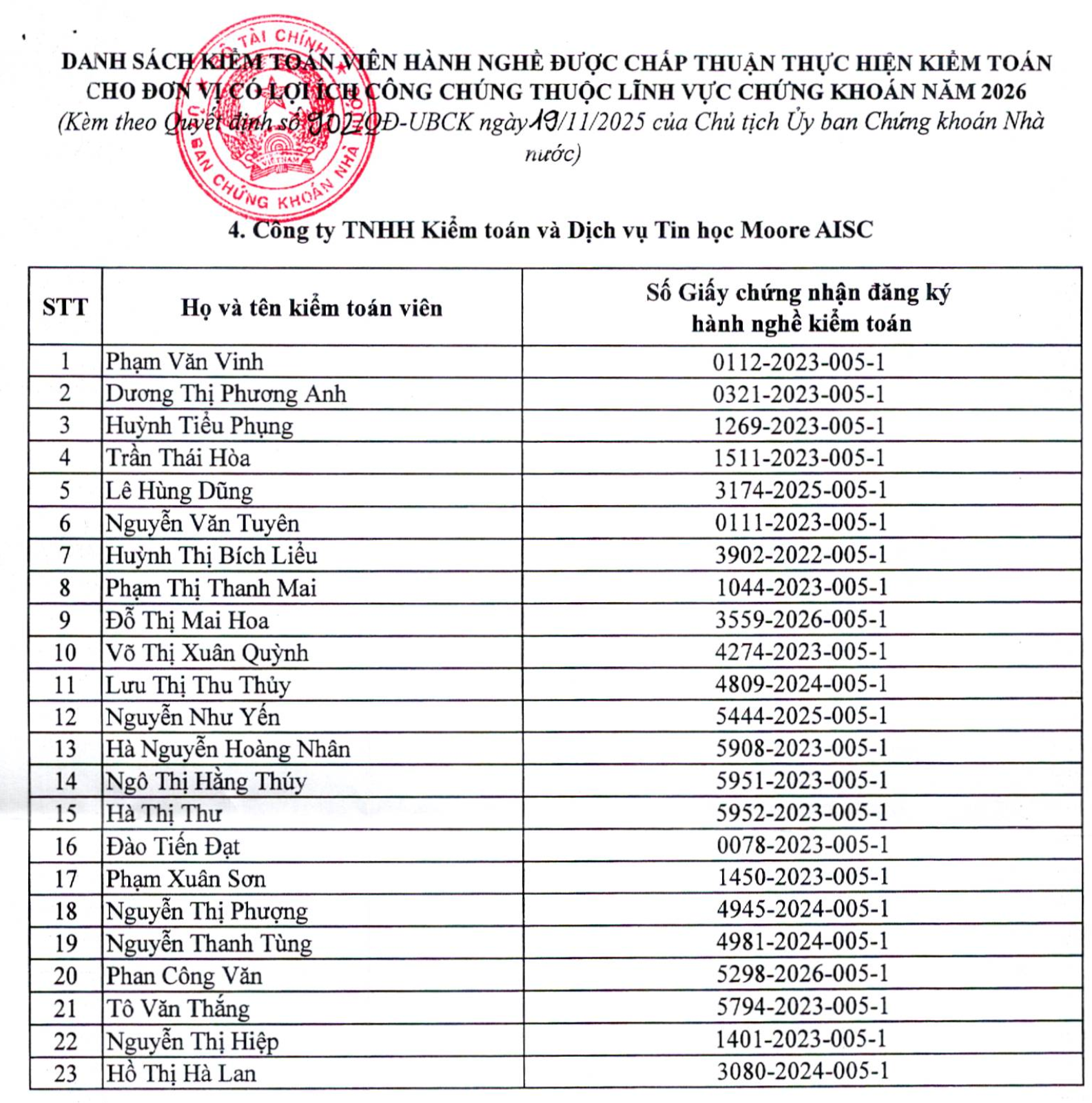 Moore AISC and practicing auditors have been approved to audit public interest entities in the securities sector in 2026, issued together with Decision No. 902/QD-UBCK dated November 19, 2025, by the State Securities Commission.